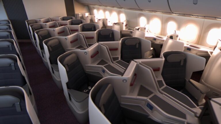 Una vez hecha esta advertencia, echemos un vistazo a estos asientos “Super Diamond” de B/E Aerospace. Últimamente se han convertido en el estándar de oro de los asientos en espina de pescado invertidos, la siempre popular configuración de asientos 1-2-1 en la que todos tienen acceso directo al pasillo y los asientos de la ventana están orientados hacia la misma, para mayor privacidad y buenas vistas.